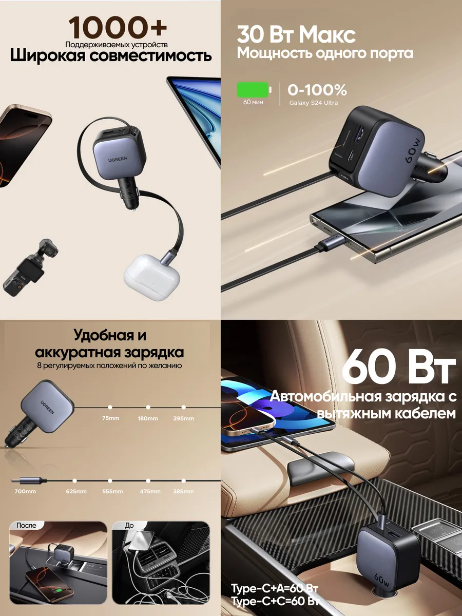 Автомобильное зарядное устройство мощностью до 60 Вт предназначено для быстрой и безопасной зарядки мобильных устройств от прикуривателя автомобиля. Оснащено разъёмами USB-C и USB-A, что позволяет подключать современные смартфоны, планшеты, навигаторы и другие гаджеты. Поддерживает технологии быстрой зарядки, автоматически подбирая оптимальные параметры питания для каждого устройства.
