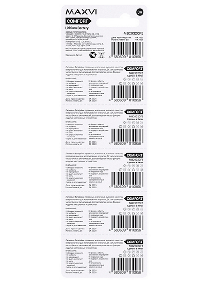Литиевые батарейки MAXVI MB2032CF5 (аналог CR2032) — это надежный источник питания для ваших устройств. Комплект из 5 элементов обеспечит вас запасом энергии на долгое время. Благодаря литиевой технологии батарейки сохраняют стабильное напряжение 3V в течение всего срока службы и устойчивы к низким температурам.