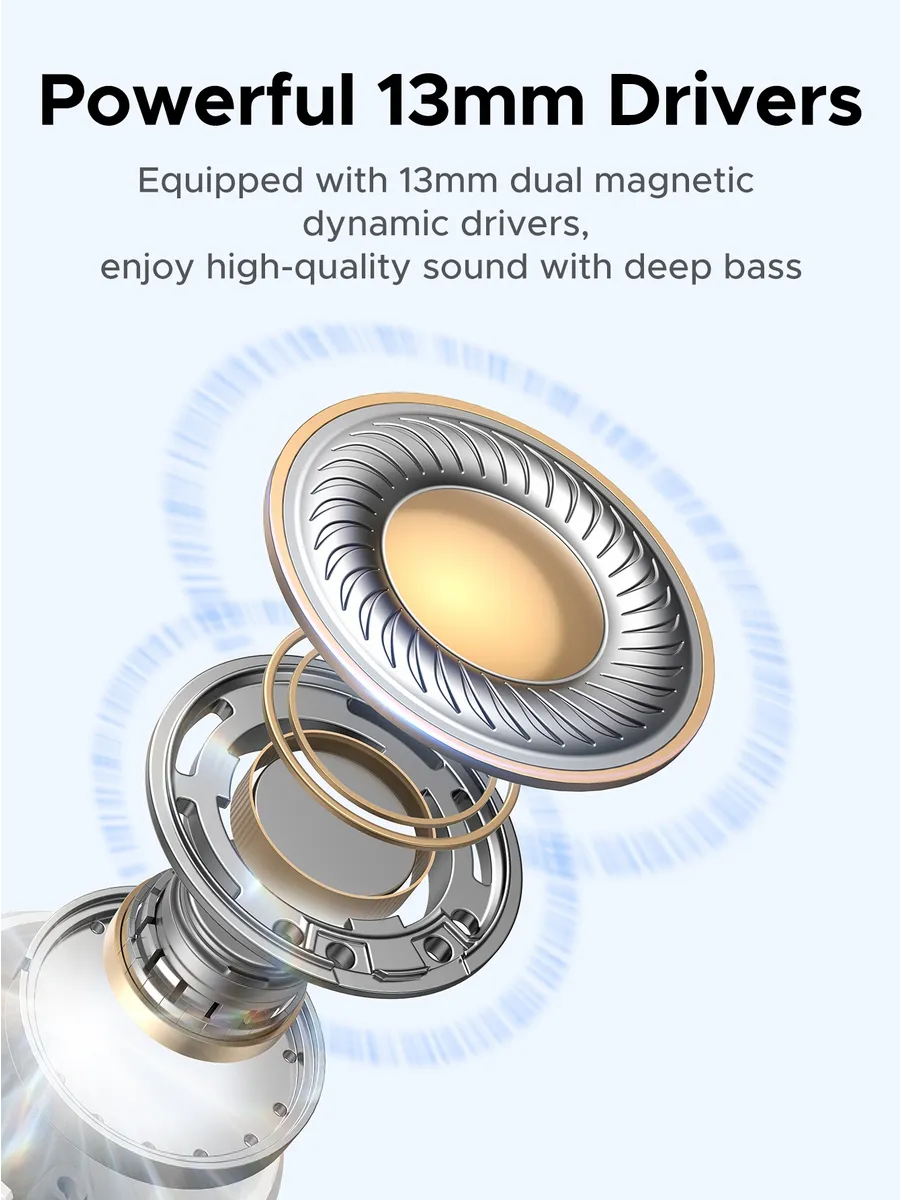 Наушники оснащены 13‑мм динамическими драйверами, обеспечивающими насыщенный звук с детализированными высокими частотами и глубокими басами. Поддержка кодеков AAC, SBC гарантирует передачу аудио в высоком разрешении. Низкая задержка делает модель удобной для игр и просмотра видео.