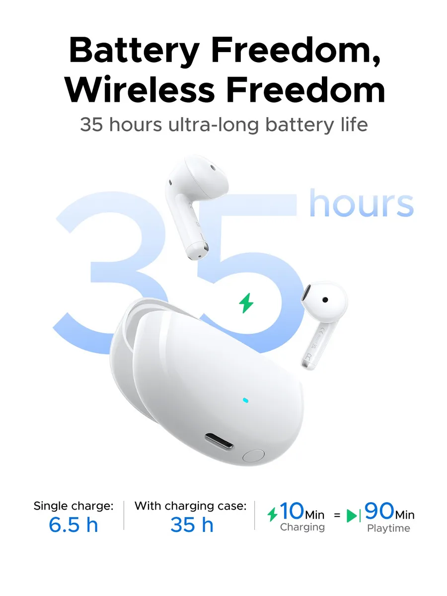 Встроенный аккумулятор обеспечивает до 6.5 часов работы на одном заряде. Зарядный кейс увеличивает общее время использования до 35 часов. Полная зарядка кейса и наушников занимает всего 1.5 часа через порт USB‑C.