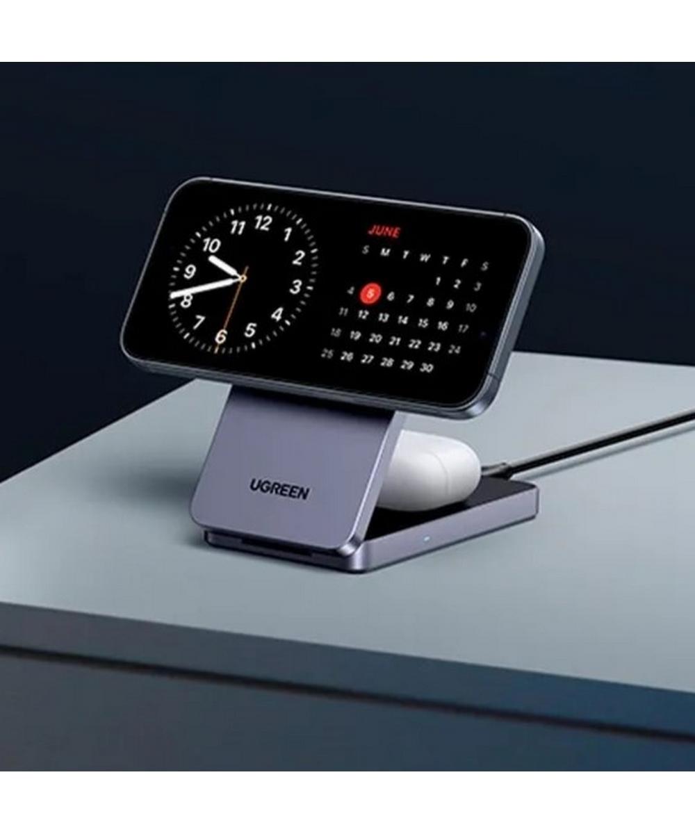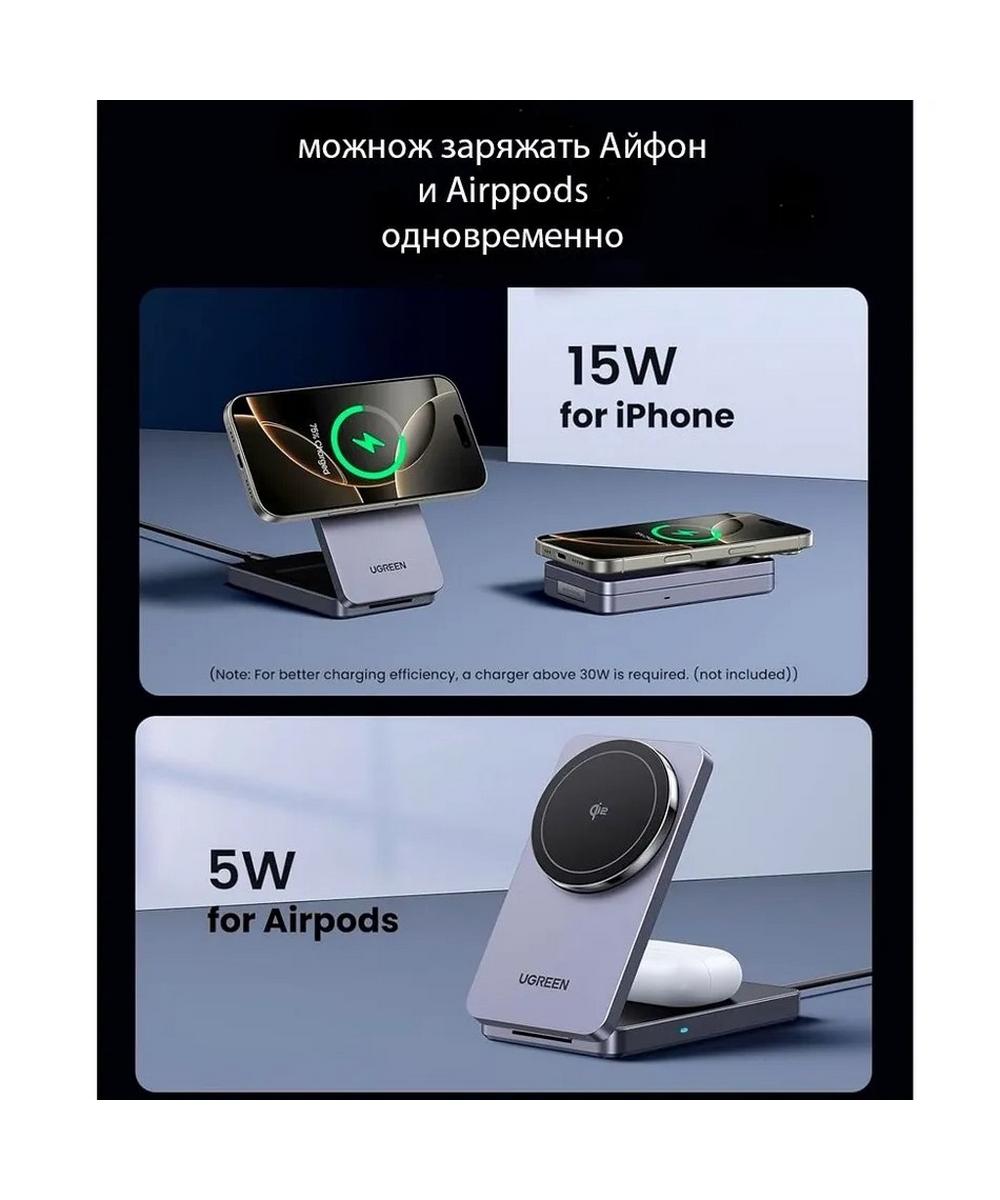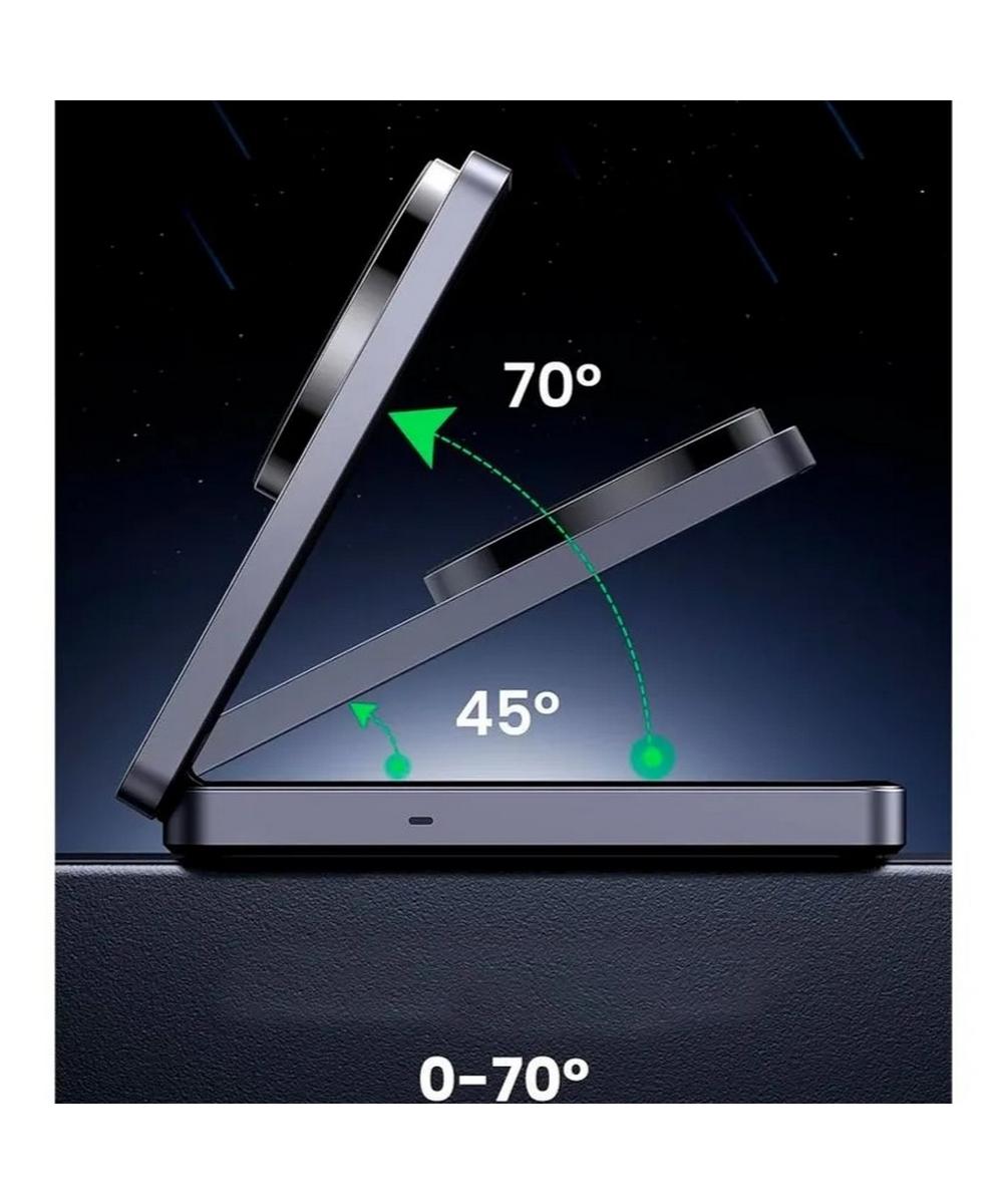 Особенности: Компактный складной дизайн, регулируемый угол наклона (до 70°), возможность одновременной зарядки двух устройств;