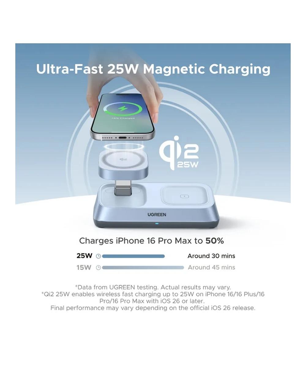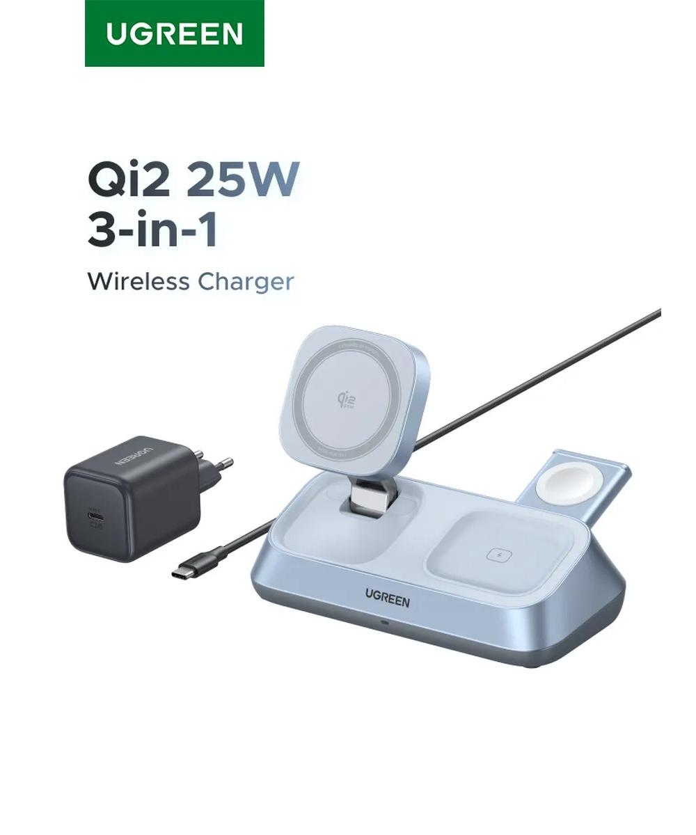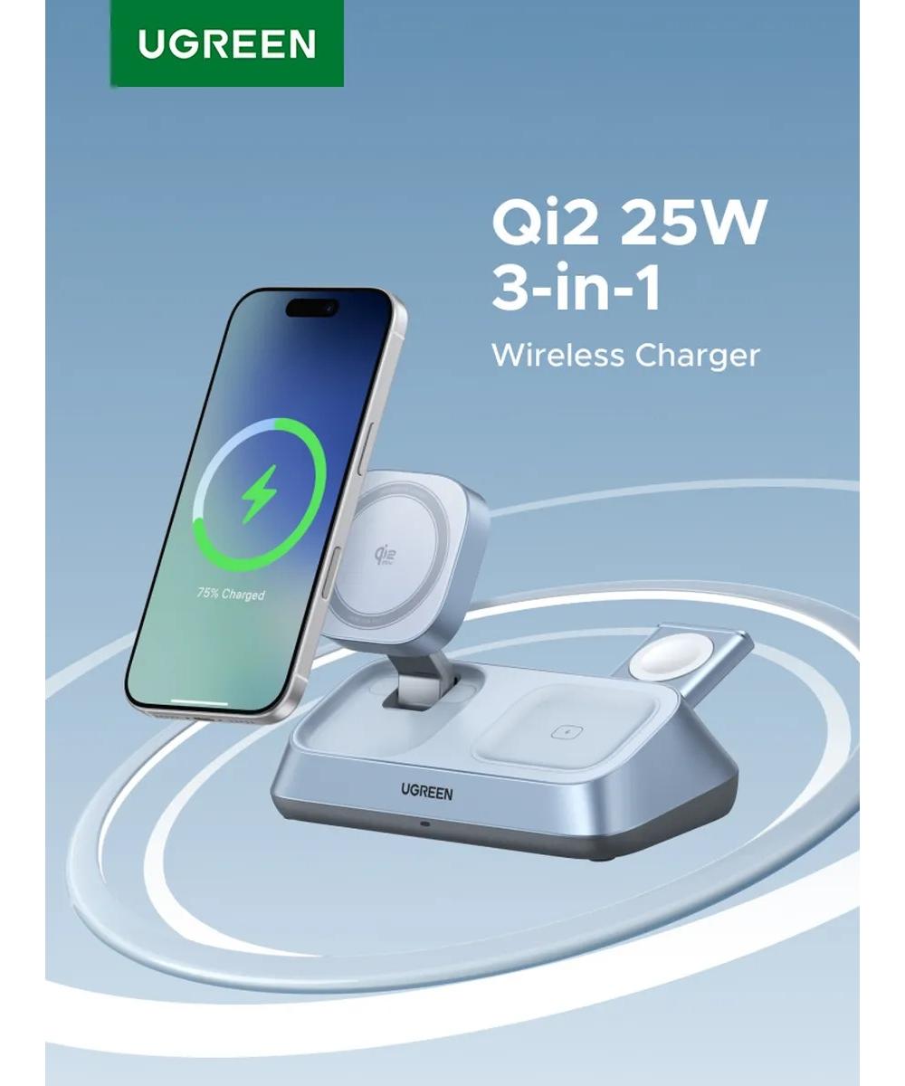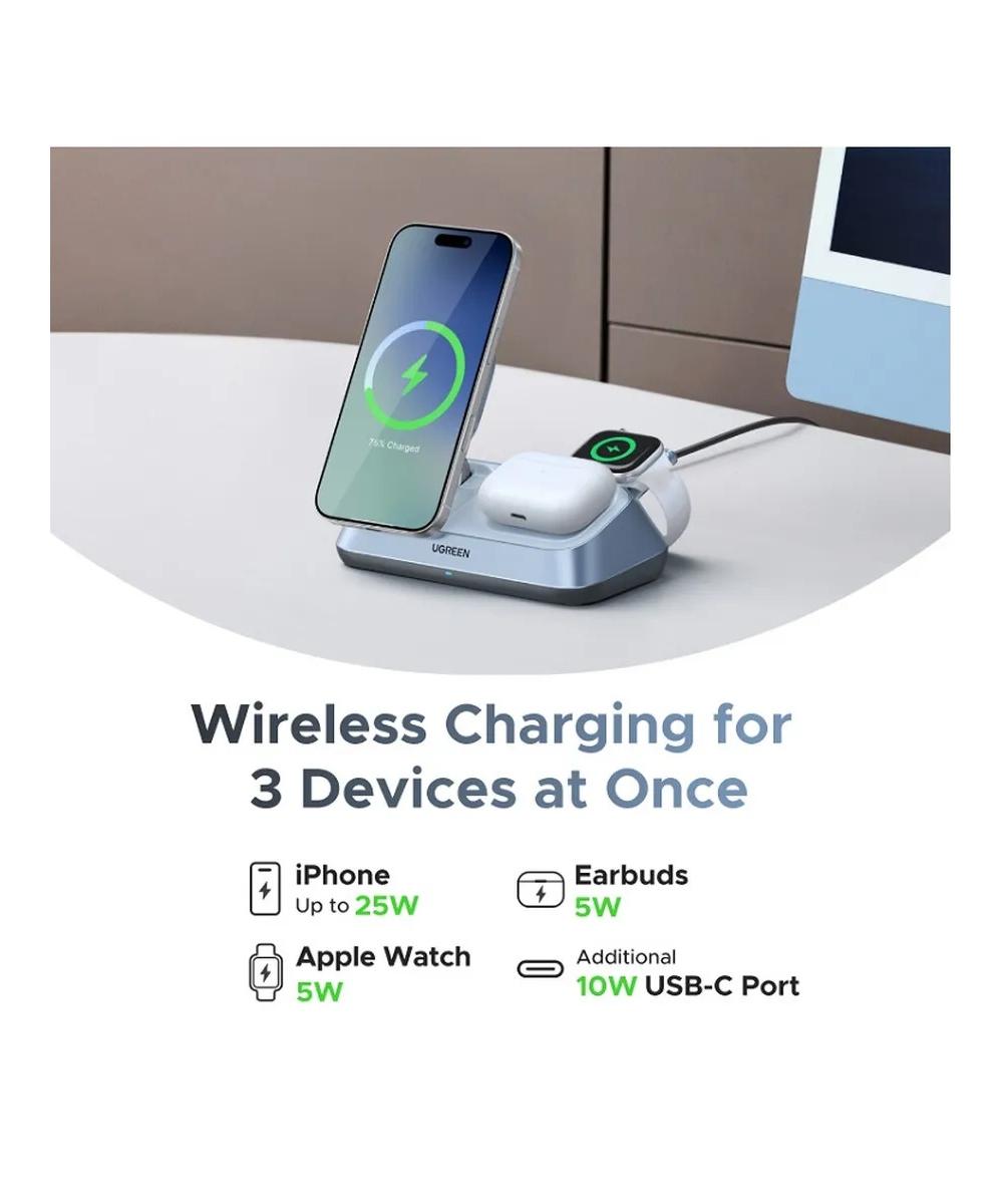 Представьте себе аккуратный и функциональный уголок на вашем рабочем столе, где царит идеальный порядок и куда возвращаются ваши устройства, чтобы быстро восстановить силы. Беспроводное зарядное устройство UGREEN MagFlow 3-в-1 — это именно такое решение, которое превращает обычный процесс подзарядки в элемент стиля и высочайшего удобства.
