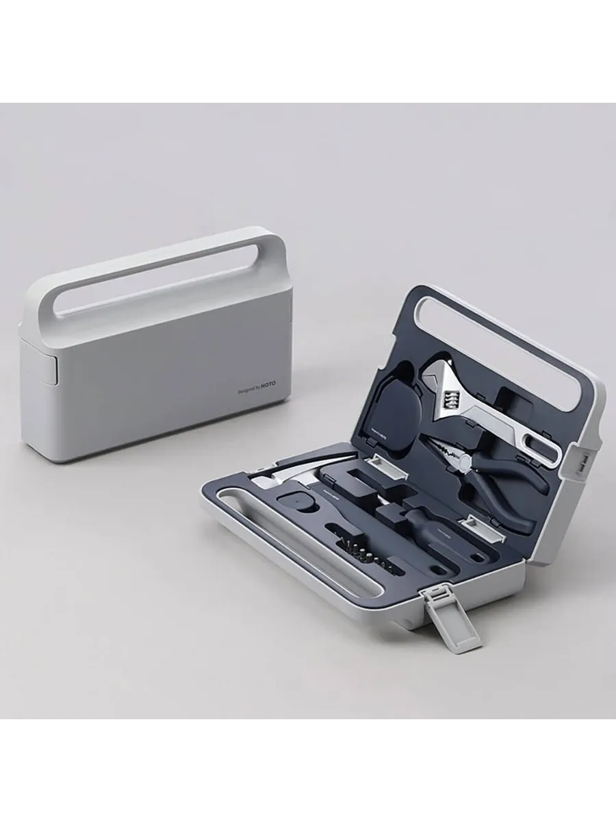 В комплект входят 10 бит из легированной стали S2, устойчивых к износу и деформации, а также набор ручных инструментов: молоток, плоскогубцы, регулируемый гаечный ключ, рулетка с автозамком и другие аксессуары. Все элементы аккуратно размещены в компактном пластиковом кейсе с ручкой.