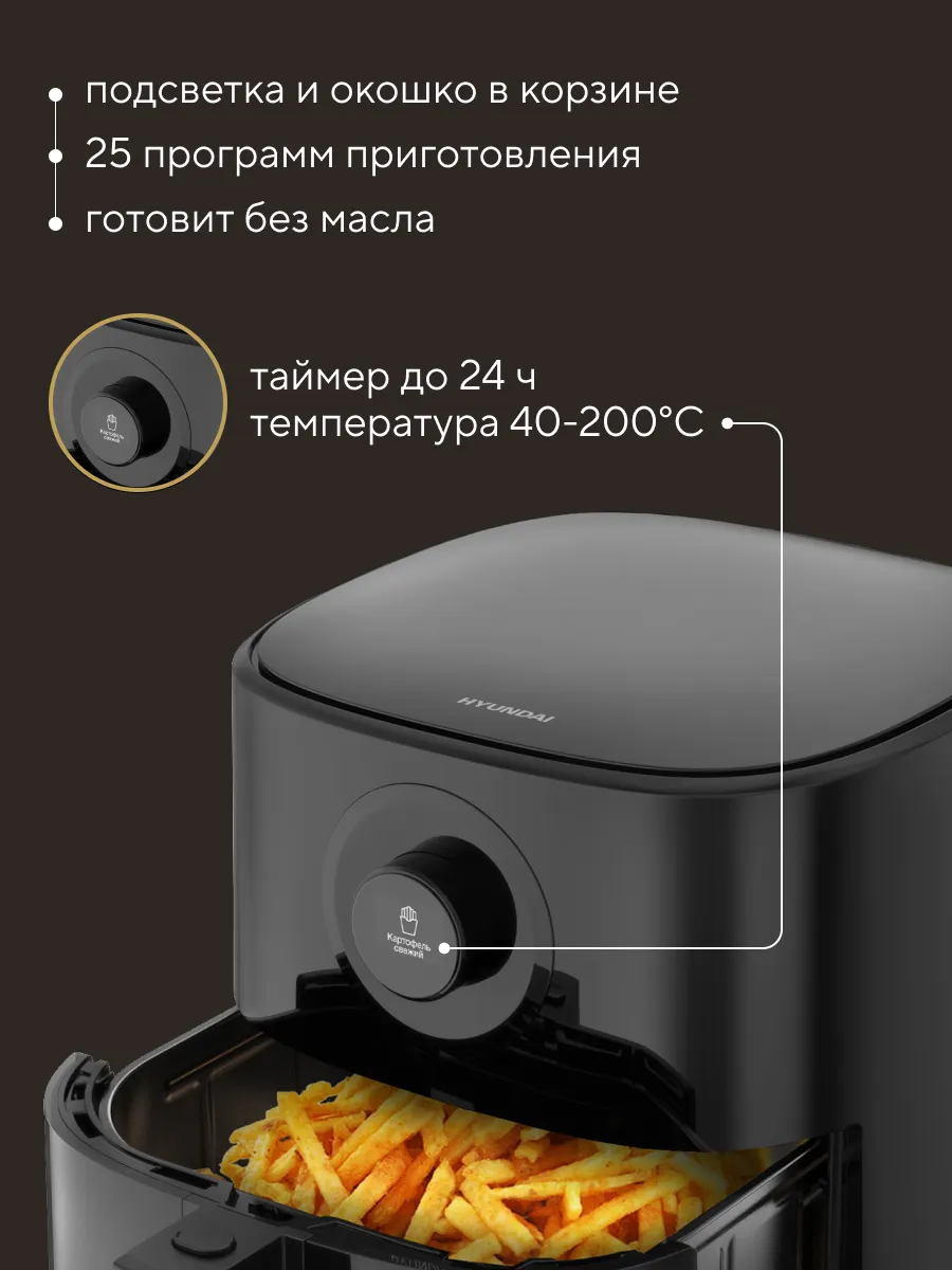 Аэрогриль HYF-5003 оснащен 25 предустановленными программами, что значительно упрощает приготовление различных блюд. Благодаря антипригарному покрытию, уход за аэрогрилем максимально прост – рабочие поверхности можно мыть в посудомойке. Смотровое окно позволяет наблюдать за процессом приготовления, не открывая крышку. Аэрогриль HYF-5003 оснащен функцией защиты от включения при открытой крышке и автоматическим защитным отключением, что гарантирует безопасность использования. Ненагревающаяся ручка обеспечивает комфортное и безопасное использование. Звуковой сигнал оповестит вас о завершении приготовления. Фиксация в закрытом положении крышки предотвращает случайное открытие во время работы.