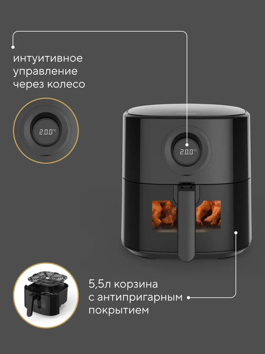 Аэрогриль HYF-5003 от HYUNDAI – это многофункциональное устройство, которое станет незаменимым помощником на вашей кухне. С его помощью вы сможете приготовить вкусные и полезные блюда, сохраняя при этом все витамины и минералы. Объем аэрогриля составляет 5.5 литра, что позволяет готовить для всей семьи. Мощный нагревательный элемент мощностью 1500 Вт обеспечивает быстрый нагрев и равномерное приготовление пищи. Управление аэрогрилем HYF-5003 осуществляется механически, что делает его простым и удобным в использовании. Вы можете установить необходимую температуру до 200 градусов, а информационный дисплей позволит контролировать процесс приготовления.
