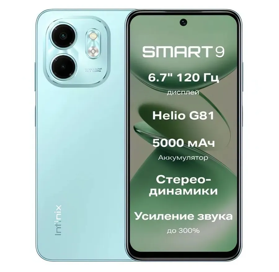 Infinix SMART 9 в черном пластиковом корпусе отображает медиаконтент на 6.7-дюймовый дисплей. Гарантом плавной смены картинки выступает частота обновления 120 Гц. Многомерность и чистота звучания достигает благодаря встроенным стереодинамикам. Подзарядка аккумулятора потребуется после 119.5-часового прослушивания треков. Верификация личности производится по чертам лица и отпечатку.