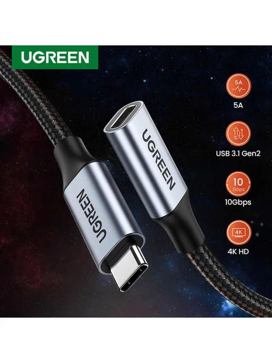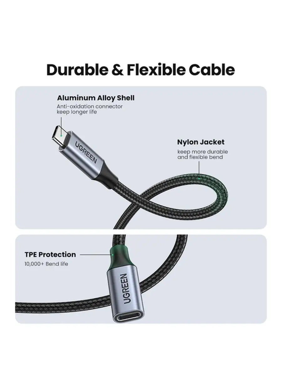 Кабель Ugreen US372 USB-C 3.1 Male to USB-C Female имеет износостойкую круглую оплетку привлекательного темно-серого цвета, что делает его одновременно надежным и стильным аксессуаром. С помощью данного кабеля можно осуществлять синхронизацию с целью передачи данных и подзарядки устройств с соответствующим портом. Металлические коннекторы гарантируют стабильную связь без помех, а кабель обладает длиной 1.0 м. Кабель Ugreen US372 предназначен для совместного использования с различной совместимой техникой.