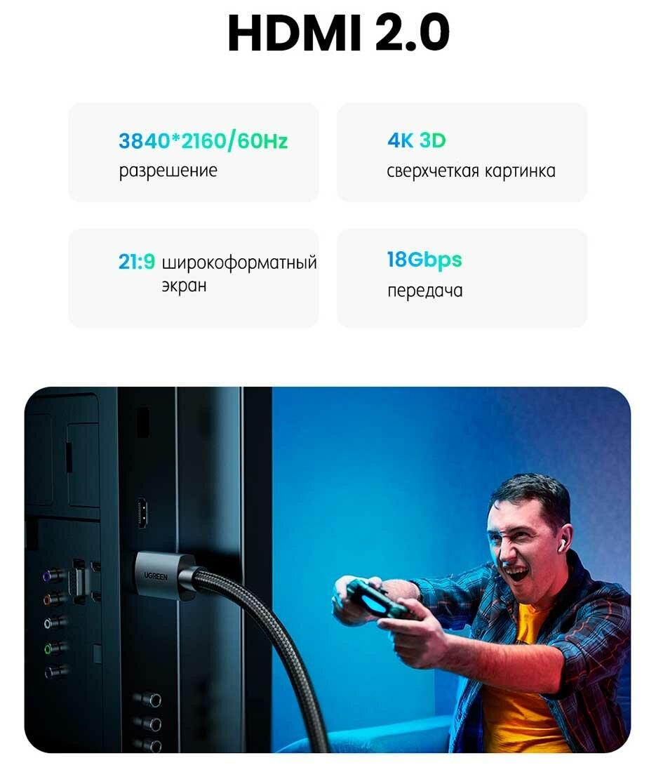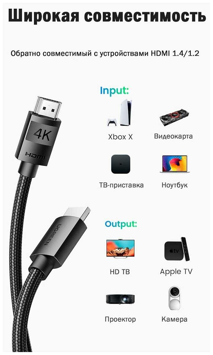 Кабель HDMI поддерживает устройства с интерфейсами HDMI 2.1/2.0/1.4/1.3 Type A, такие как Fire TV, NS Switch, Wii U, MacBook, ноутбуки, игровые приставки (PS5/PS4/PS3, Xbox One/360), телеприставки Andriod TV, проигрыватель Blu-ray 4K, DVD, UHD HDTV, звуковые панели с поддержкой HDMI ARC, проектор, монитор, дисплей и т. д. Получите изображения 4K UHD, HDR с кабелем UGREEN 4K HDMI 2.0.