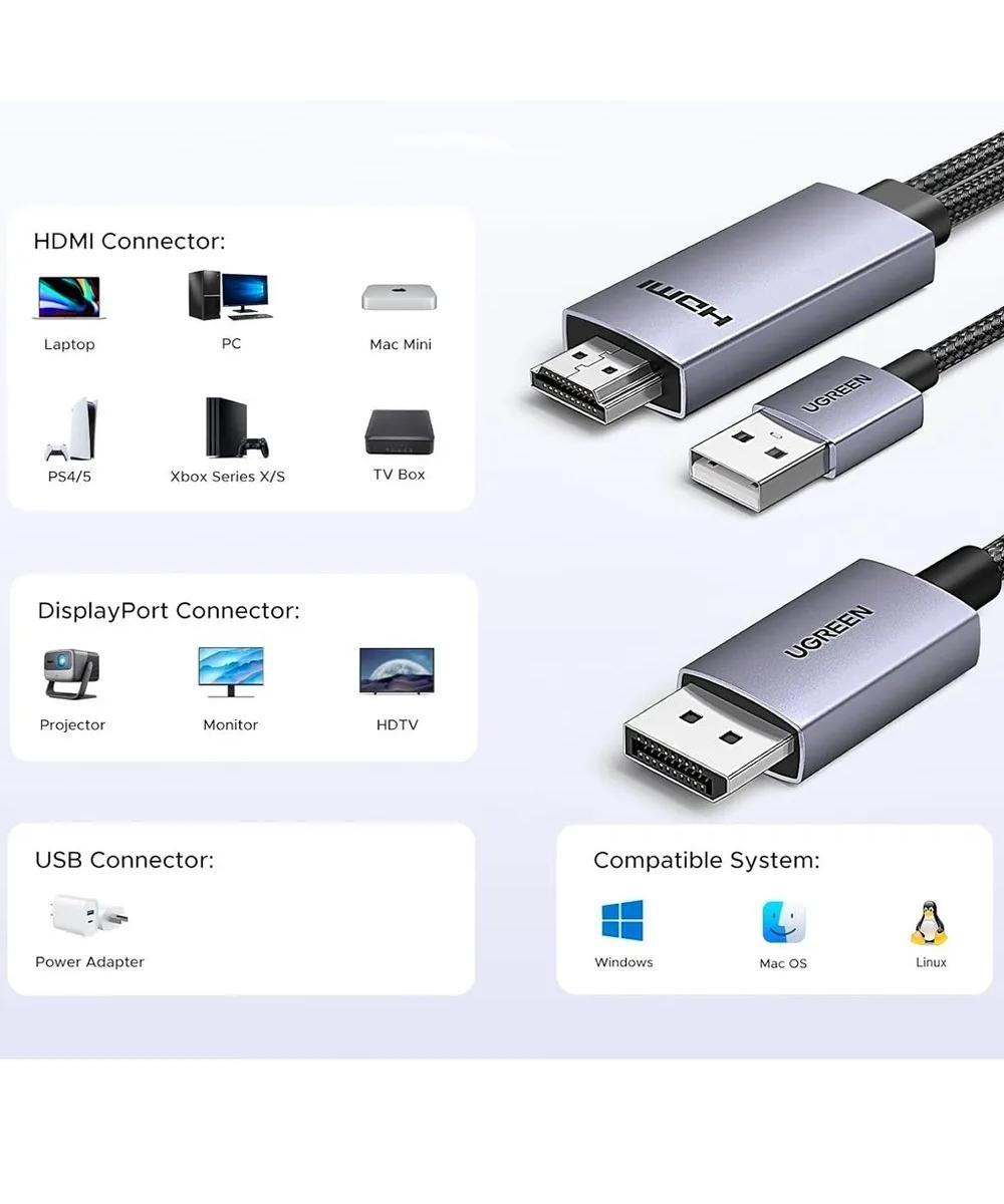 Кабель UGREEN HD169 (55329) HDMI to DisplayPort 4K@60Hz Cable длиной 2 метра серого цвета предназначен для односторонней передачи аудио- и видеосигнала с устройств, оснащённых HDMI-выходом, на дисплеи, мониторы или телевизоры с портом DisplayPort.