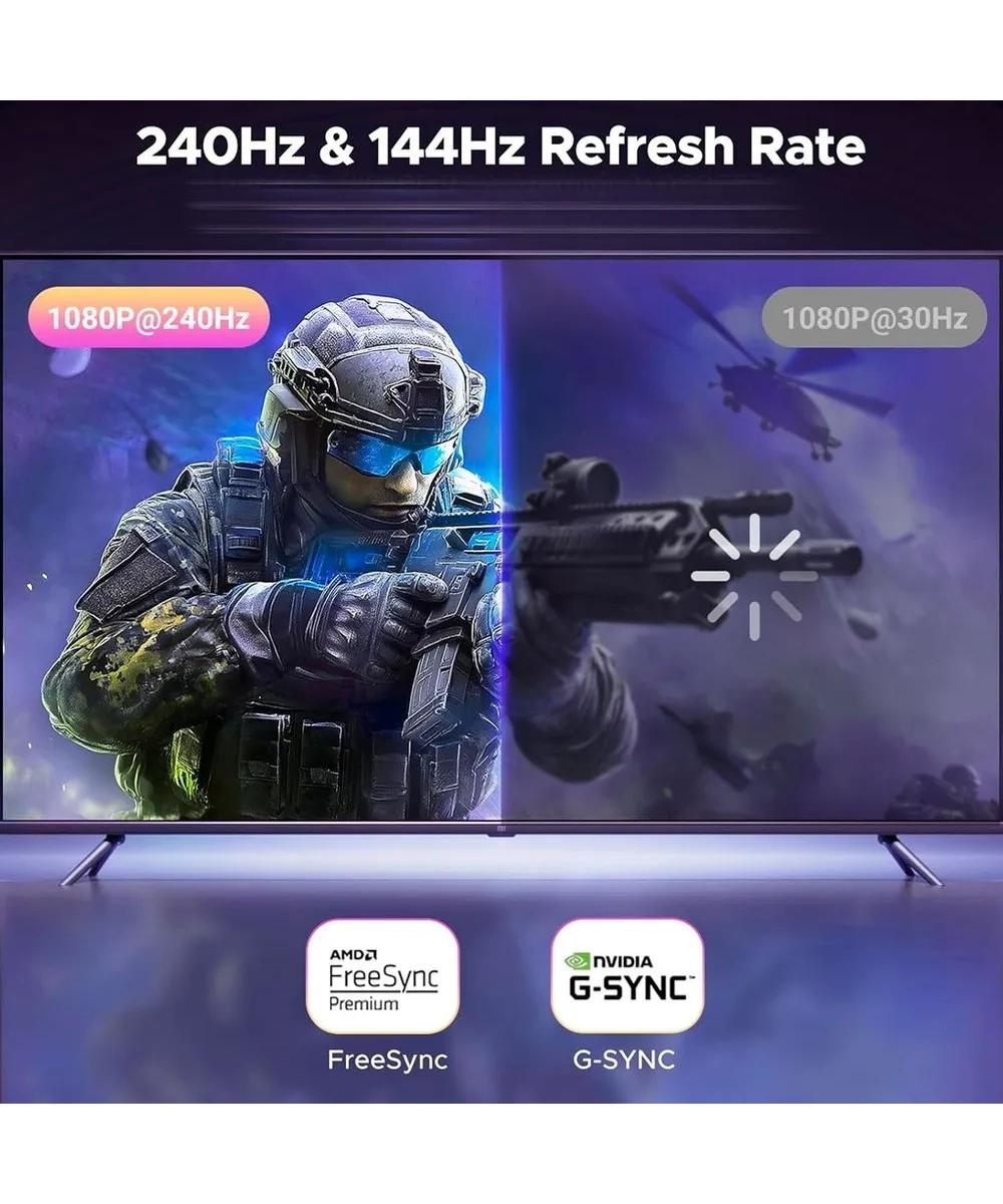 передаёт изображение в разрешении 4K с частотой 60 Гц, 2K при 144 Гц и 1080p до 240 Гц;