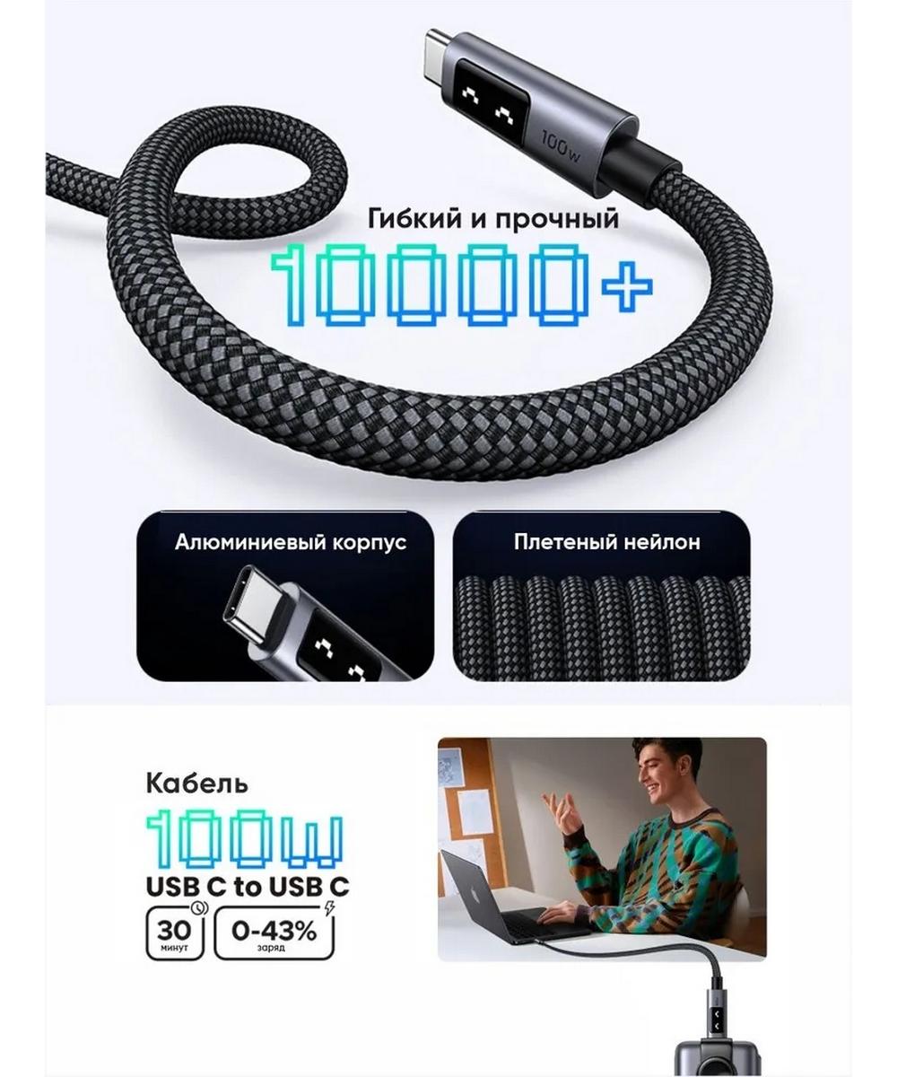 Кабель имеет длину 0,5 м и круглую форму, а его конструкция отличается высокой прочностью: корпус выполнен из пластика, разъёмы — из алюминия, а нейлоновая оплётка защищает кабель от износа при ежедневном использовании. Встроенный чип E-Marker контролирует подачу тока до 5 А, обеспечивая стабильную работу и безопасность зарядки.