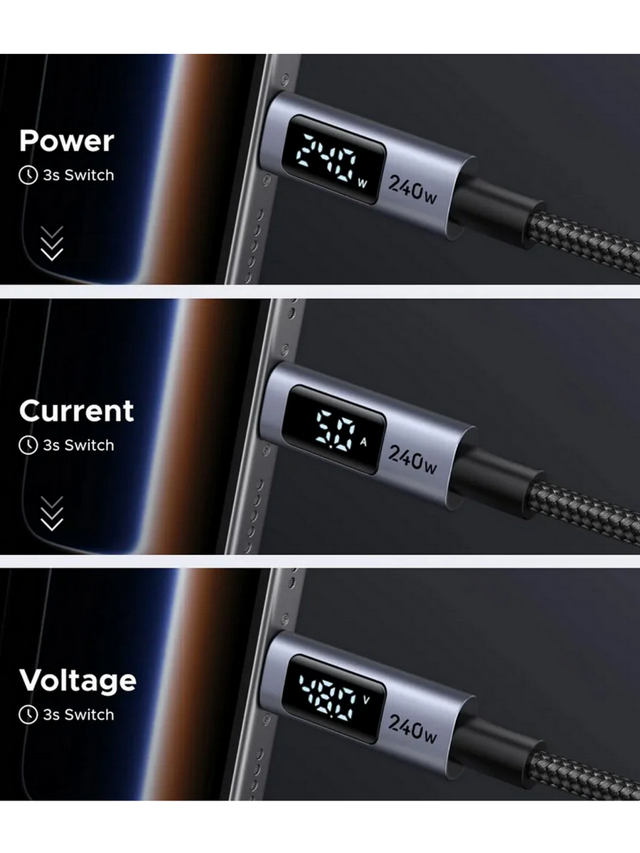 Интеллектуальный цифровой дисплей: Эксклюзивный светодиодный экран отслеживает состояние зарядки в режиме реального времени: циклически отображает мощность (Вт), ток (А) и напряжение (В) с автоматическим переключением каждые 3 секунды (последовательность отображения: мощность → ток → напряжение), точно отслеживая потребляемую мощность устройства и предотвращая повреждение при перезарядке.