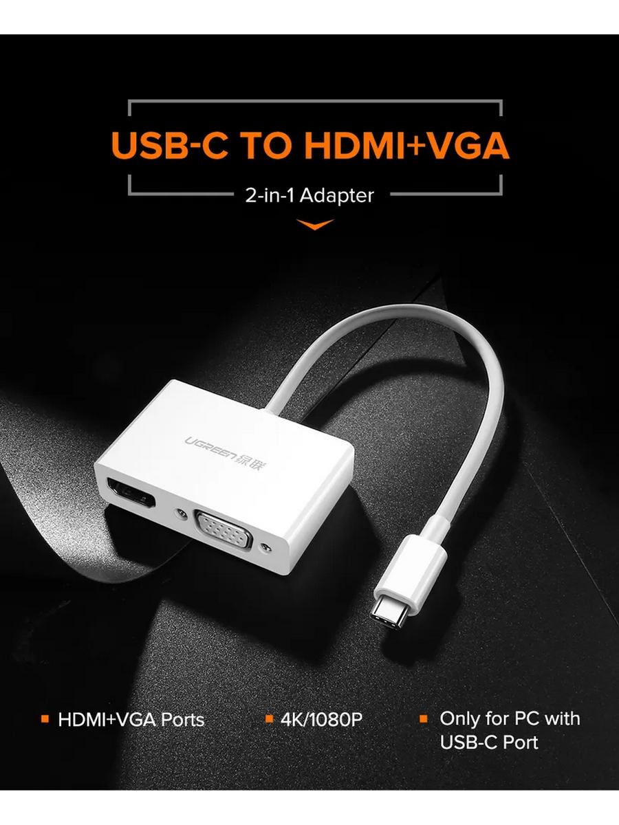 Переходник UGREEN MM123 USB Type-C/HDMI + VGA Converter - оптимальное решение для применения как во время работы, так и для отдыха. Благодаря оплетке, слою из фольги и токопроводящим жилам из высококачественной луженой меди обеспечивается стабильная производительность модели. С помощью устройства можно подключить ноутбук с разъемом USB Type-C к монитору компьютера или телевизора, имеющим порт HDMI или VGA. За счет этого пользователь может одновременно работать с двумя экранами.