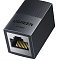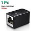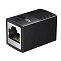 Корпус устройства выполнен из прочного пластика и имеет чёрный цвет. Конструкция включает два разъёма RJ-45 (Female-Female) с экранированием, что снижает уровень электромагнитных помех и повышает надёжность соединения. Поддерживается работа с кабелями до категории 7 и частотная полоса пропускания до 600 МГц.