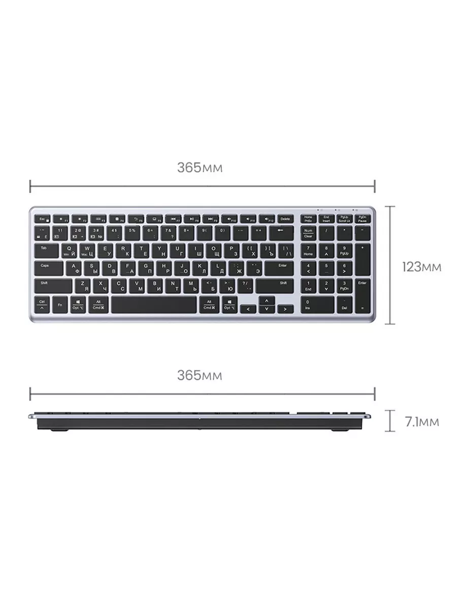 Беспроводная клавиатура Ugreen KU005 (15956) серебристого цвета обладает массой 500 г. В комплекте поставляется приемный блок. На лицевой стороне размещается индикатор Caps Lock. Корпус изготавливается из пластика. У модели 99 механических клавиш. Подключение осуществляется через модуль Bluetooth.