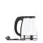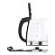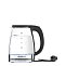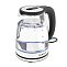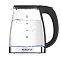 Корпус этой модели сделан из полностью прозрачного термостойкого стекла и дополнен деталями из нержавеющей стали. При закипании включается эффектная подсветка. Круглое основание позволяет поворачивать прибор на 360° и брать с любой стороны. В носике установлен фильтр, который задерживает накипь и не даёт ей попасть в чашки.