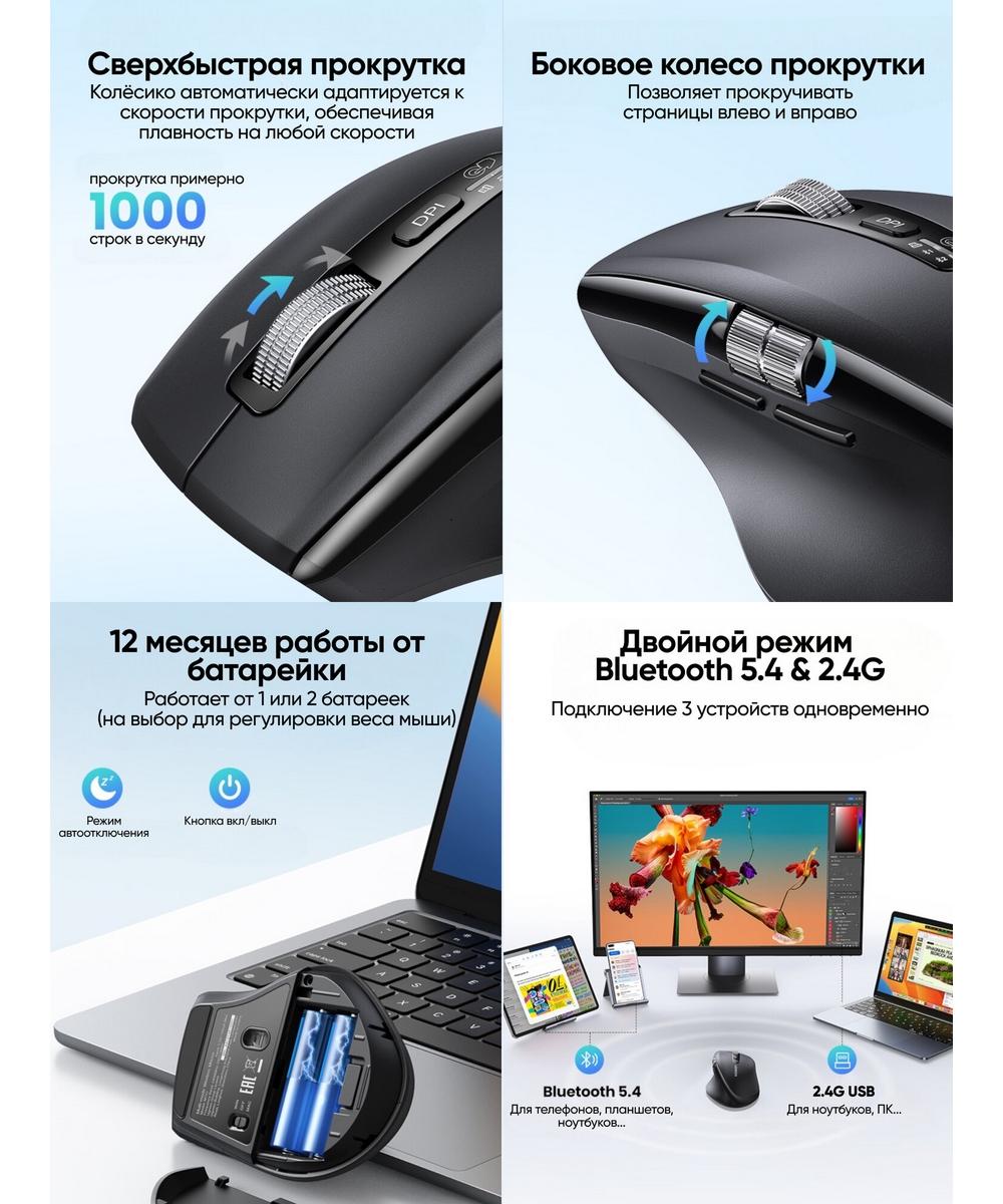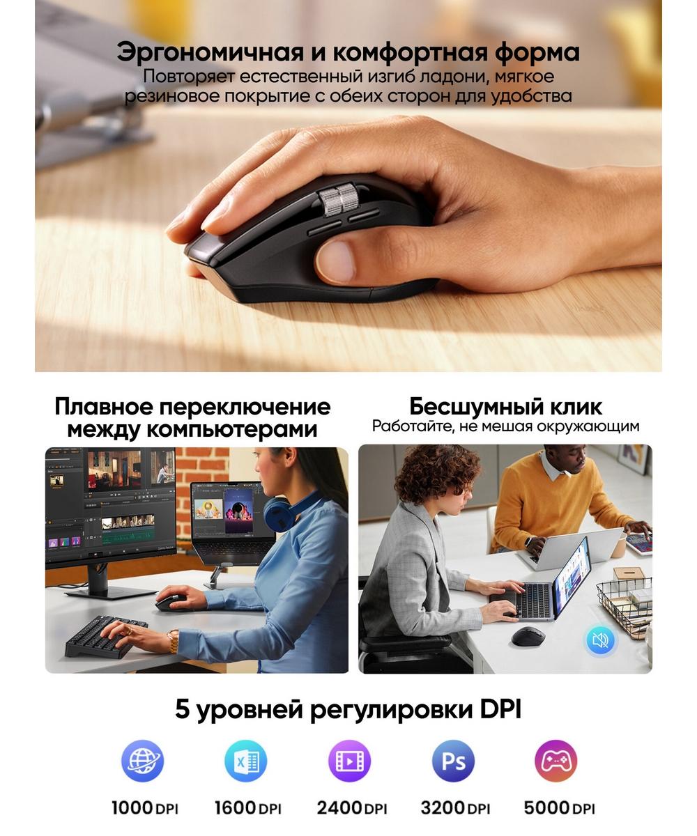 Двойное соединение и поддержка нескольких устройств: Благодаря возможности работы через Bluetooth 5.4 и 2.4GHz вы можете использовать мышь с широким спектром устройств — от ноутбуков до планшетов и смартфонов. Функция подключения до трёх устройств с мгновенным переключением одной кнопкой значительно упрощает работу, особенно если вам нужно быстро менять рабочий контекст или управлять разными гаджетами.