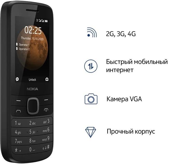 Nokia 225 4G — классический телефон с современными функциями. Вам будут доступны преимущества технологий 4G: передача голоса высокой четкости, соцсети и многопользовательские игры. Клавиатура и выделенные функциональные клавиши созданы для быстрого набора сообщений и удобной навигации. Глянцевый корпус с премиальным покрытием надёжно защищен от царапин. Nokia 225 4G — долговечный телефон с мощной батареей и закругленным корпусом, который удобно держать в руке. Предусмотрено все необходимое для отдыха и развлечений — Facebook, камера, "Змейка" и пробные версии других игр.
