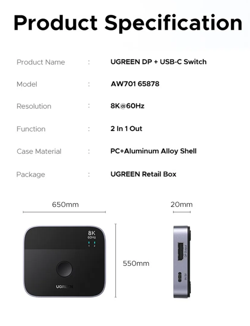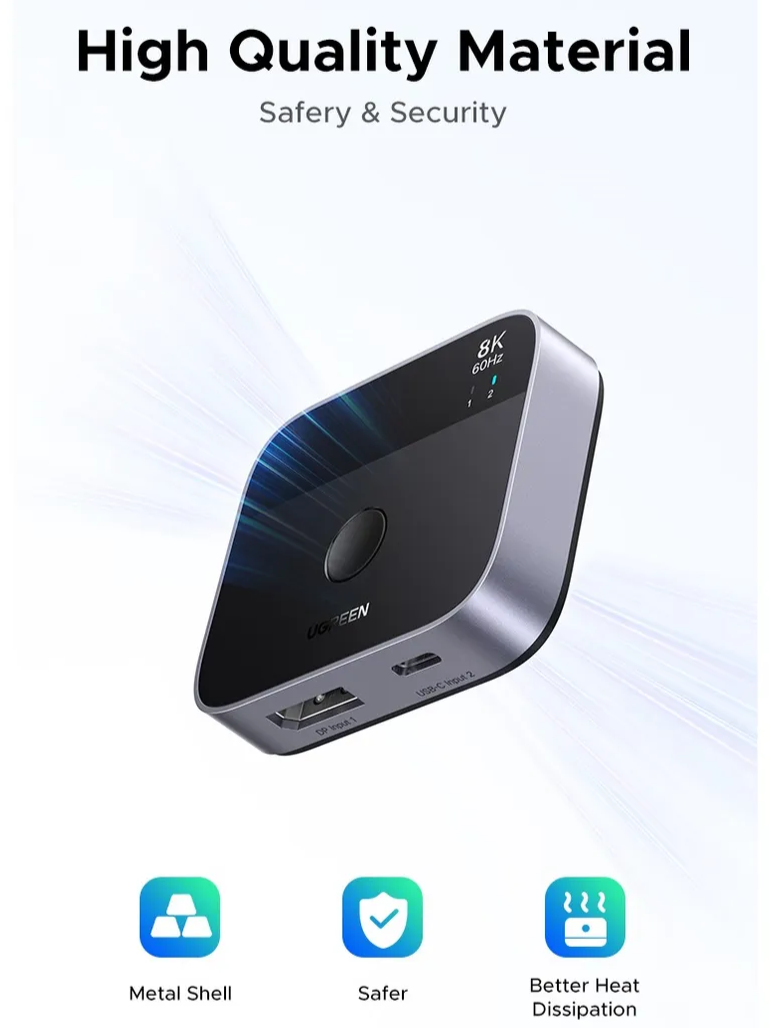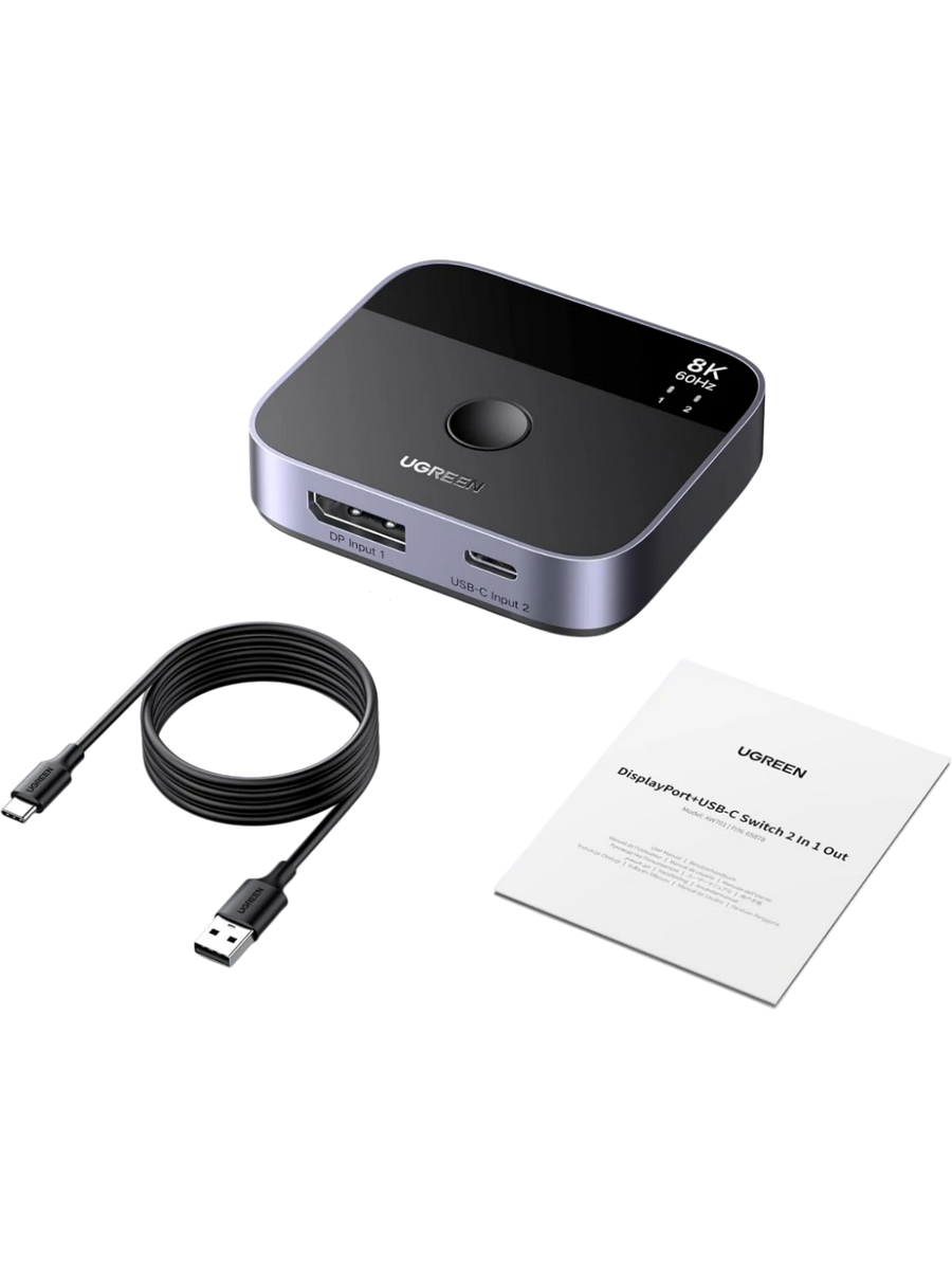 UGREEN AW701 (65878) — это универсальный коммутатор 2-в-1, который позволяет удобно переключаться между устройствами с интерфейсами DisplayPort и USB-C, обеспечивая стабильную передачу изображения и данных. Устройство выполнено в компактном корпусе черного цвета, гармонично вписывается в рабочее пространство и не занимает много места на столе.