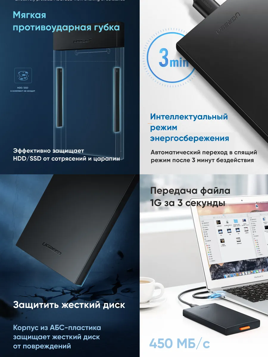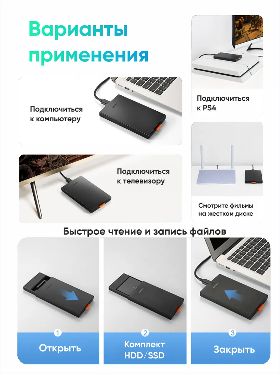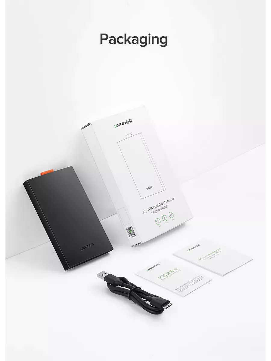 2,5-дюймовый корпус жесткого диска UGREEN позволяет легко подключить 2,5-дюймовый жесткий диск SATA к ПК, ноутбуку, PS4 и другим устройствам для передачи данных, обеспечивая более объемное хранилище резервных копий и лучшую защиту данных. 2,5-дюймовый корпус защищает жесткий диск от внешних царапин и делает внешний жесткий диск SATA HDD и SSD портативным для хранения данных.