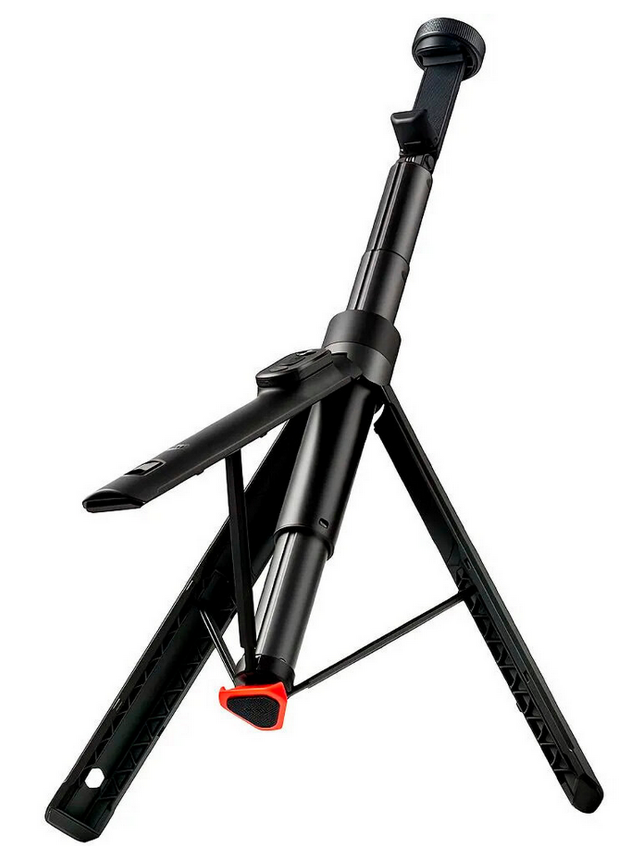 Телескопическая штанга выполнена из алюминиевого сплава, что обеспечивает прочность и лёгкость конструкции. Основание изготовлено из металла и пластика с устойчивой опорой, позволяющей использовать устройство как полноценный напольный трипод. Минимальная длина составляет около 30 см, что делает аксессуар удобным для переноски и хранения. Вес конструкции около 404 г обеспечивает баланс между мобильностью и устойчивостью.