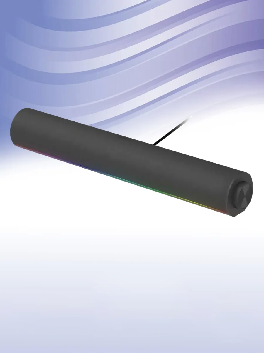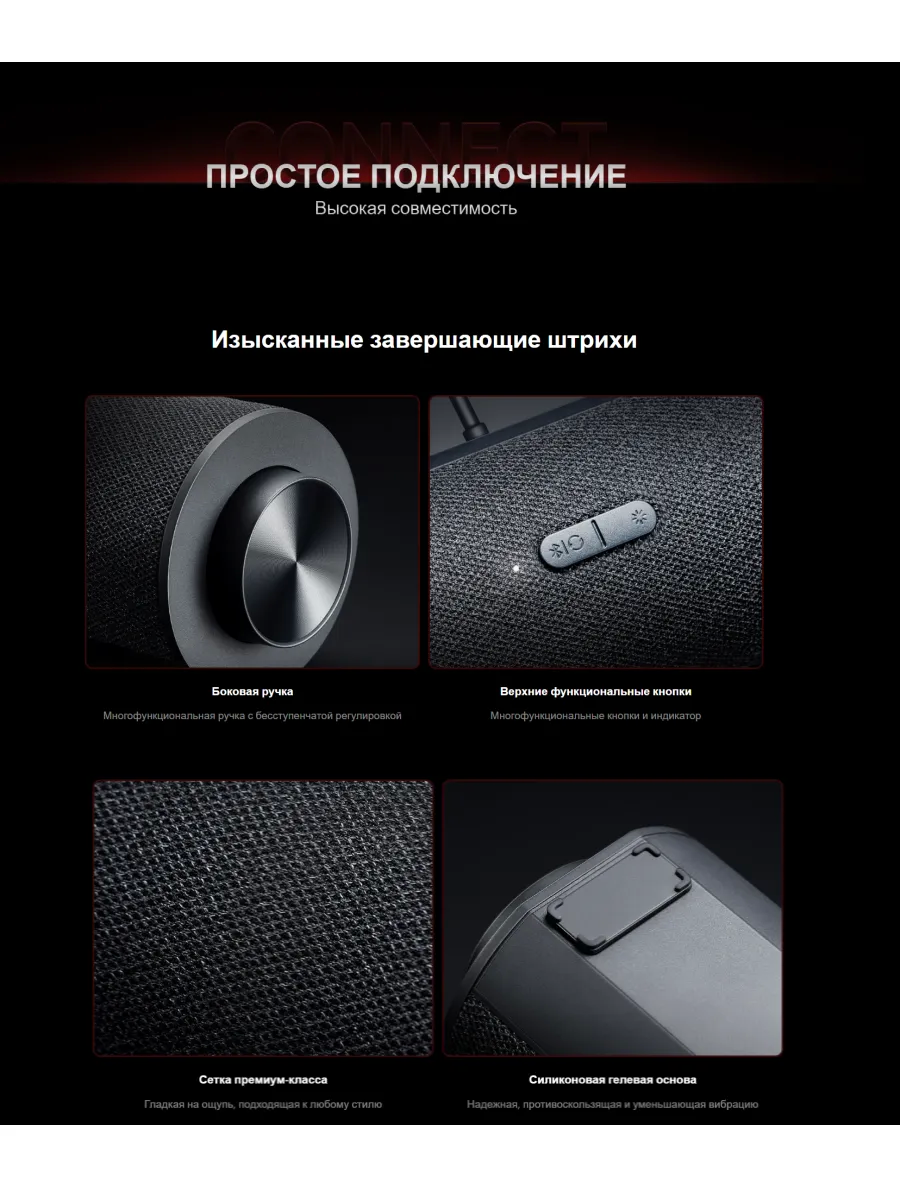 Саундбар имеет пять режимов RGB-подсветки из 16 светодиодов, расположенных в ряд в нижней части корпуса.