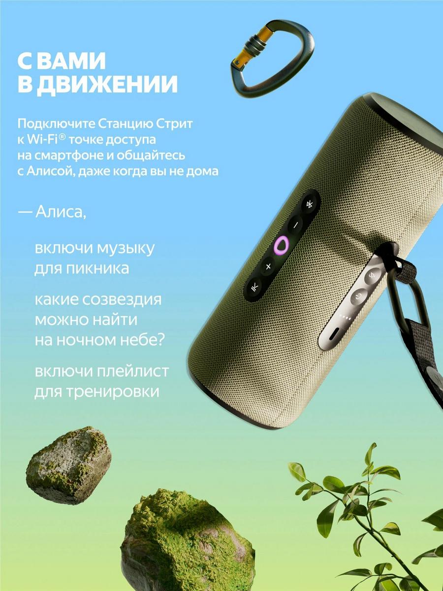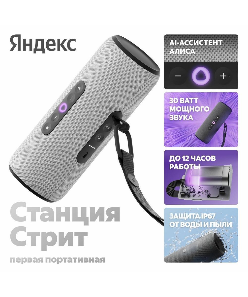 Яндекс Станция Стрит — первая портативная умная колонка Яндекса с мощным звучанием, AI-ассистентом Алисой и ёмким аккумулятором. Берите её с собой, куда бы вы ни отправились, и управляйте любимой музыкой голосом по Wi-Fi и Bluetooth.