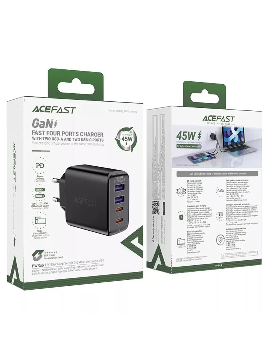 При помощи данной зарядки возможно заряжать сразу 4 устройства одновременно. На корпусе Acefast A61 расположены 2 разъема USB Type-C и 2 разъема USB. При этом максимальная мощность зарядки может достигать 45 Вт. Также, порты USB Type-C поддерживают быструю зарядку по стандартам Power Delivery и Quick Charge (PD2.0 / PD3.0 / QC4+ / QC3.0 / QC2.0), и порты USB поддерживают быструю зарядку Quick Charge (QC3.0 / QC2.0).