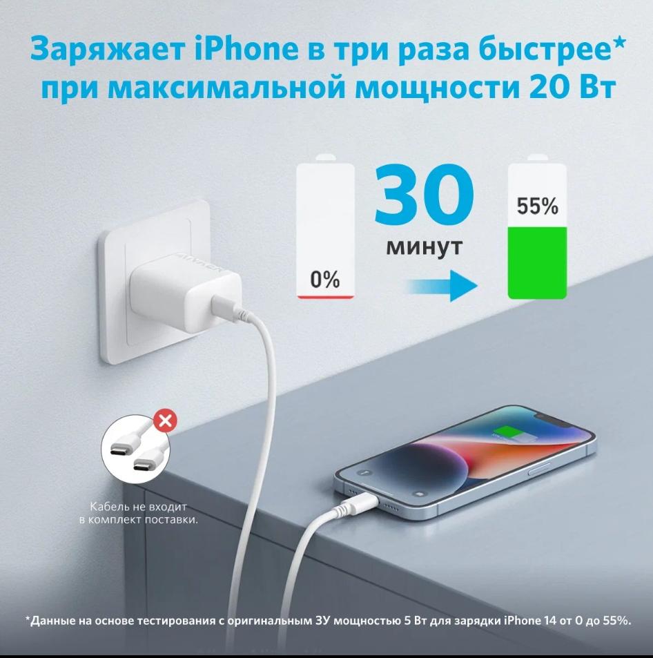 Адаптер питания ANKER 312 USB-C 20W (A2347) с кабелем в белом цвете - это удобное и компактное устройство, предназначенное для зарядки различных электронных устройств.