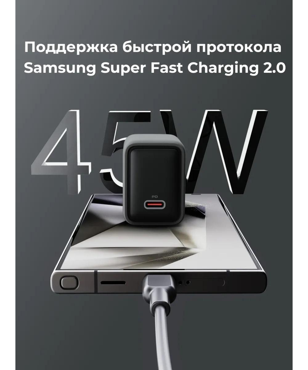 Зарядный блок оборудован одним портом USB Type-C, функцией быстрой зарядки с мощностью до 45 Вт и всё это в лёгком, компактном корпусе