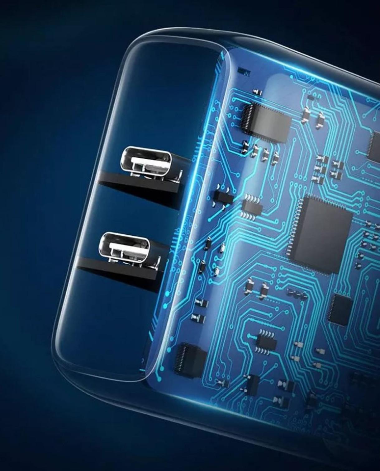 Зарядное устройство с двумя портами USB Type-C и поддержкой технологии Power Delivery (PD), предназначенное для быстрой зарядки смартфонов, планшетов, ноутбуков и других устройств.