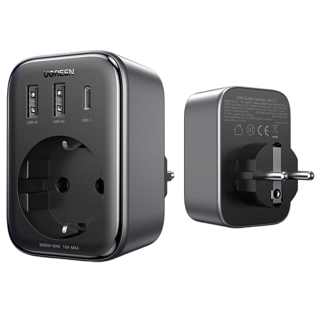 Компактное устройство которое совмещает в себе трехпортовый GaN зарядник и стандартную розетку. Корпус розетки традиционно для GaN устройств Ugreen выполнен из черного матового пластика. Конструкция прочная и монолитная. На лицевой стороне устройства находится гнездо стандартной розетки европейского типа с защитой.