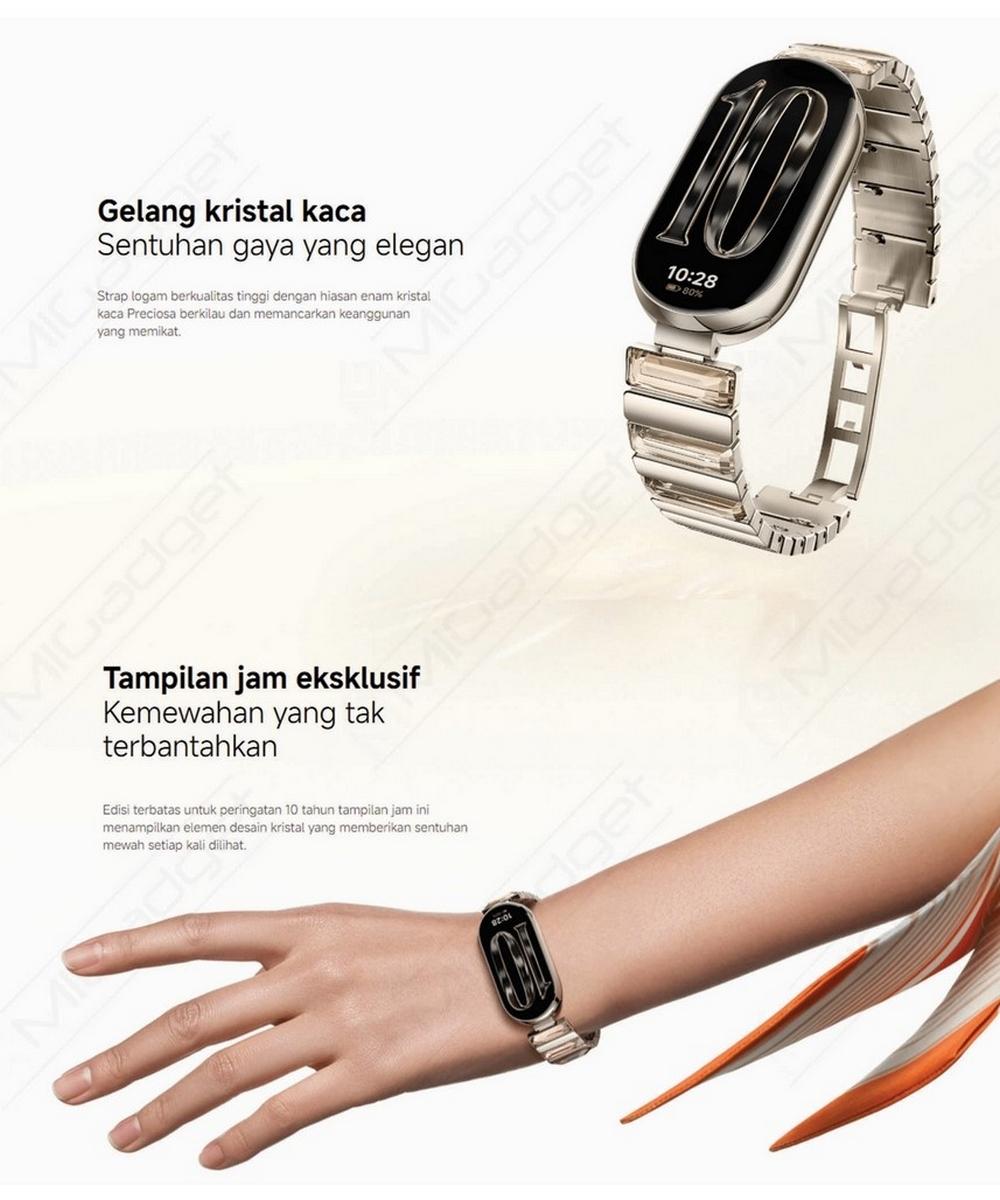 Xiaomi Smart Band 10 Glimmer Edition — это не просто фитнес-браслет, а стильный аксессуар, который подчёркивает статус владельца. В специальной версии используется изысканный ремешок с хрустальными элементами бежевого оттенка, напоминающими огранённые бриллианты. Каждая грань переливается в свете, создавая впечатление премиального ювелирного украшения.