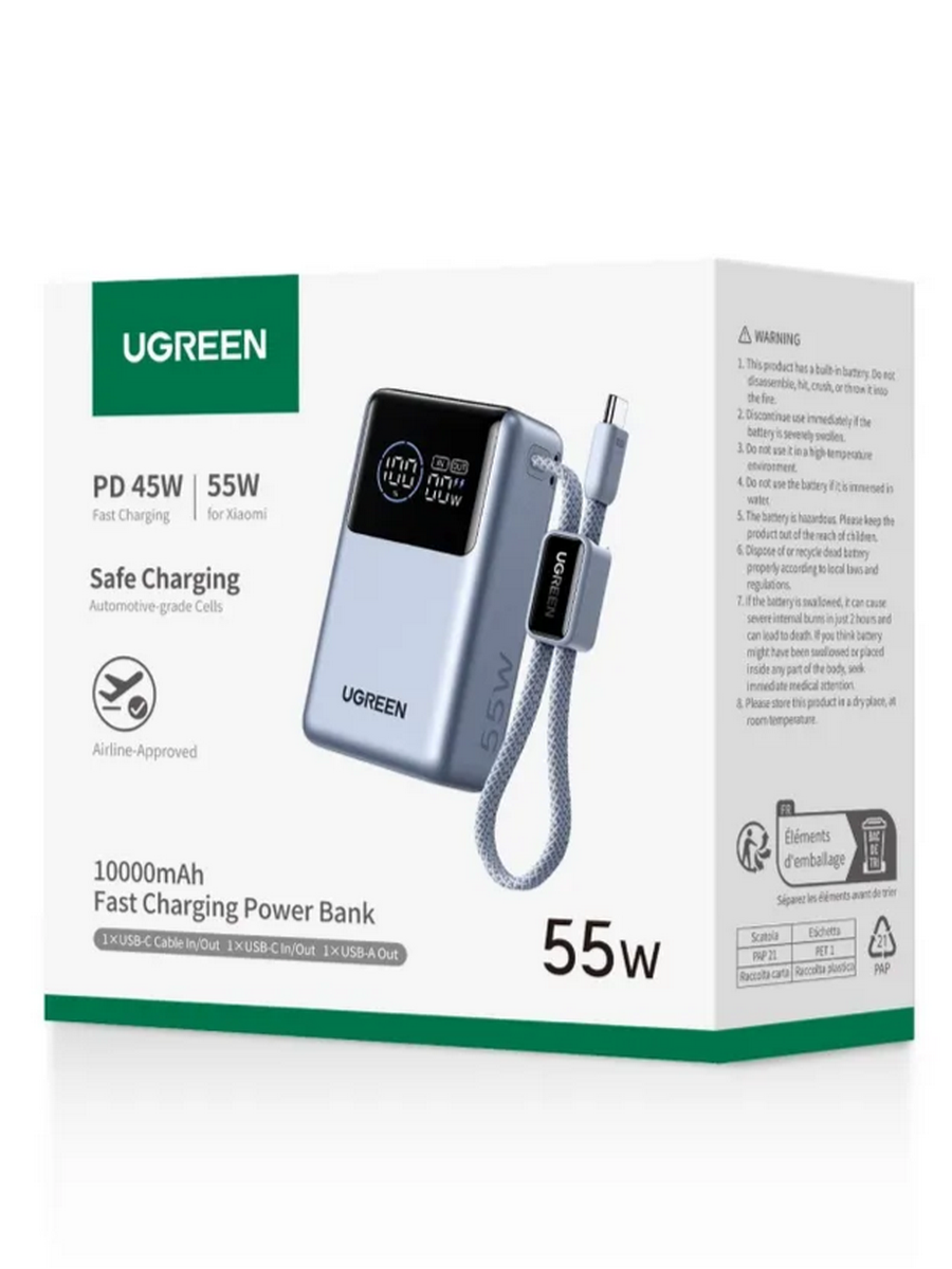 Повербанк поддерживает быструю зарядку мощностью до 55 Вт, что позволяет эффективно заряжать не только телефоны, но и планшеты или даже некоторые компактные ноутбуки в режиме подпитки.