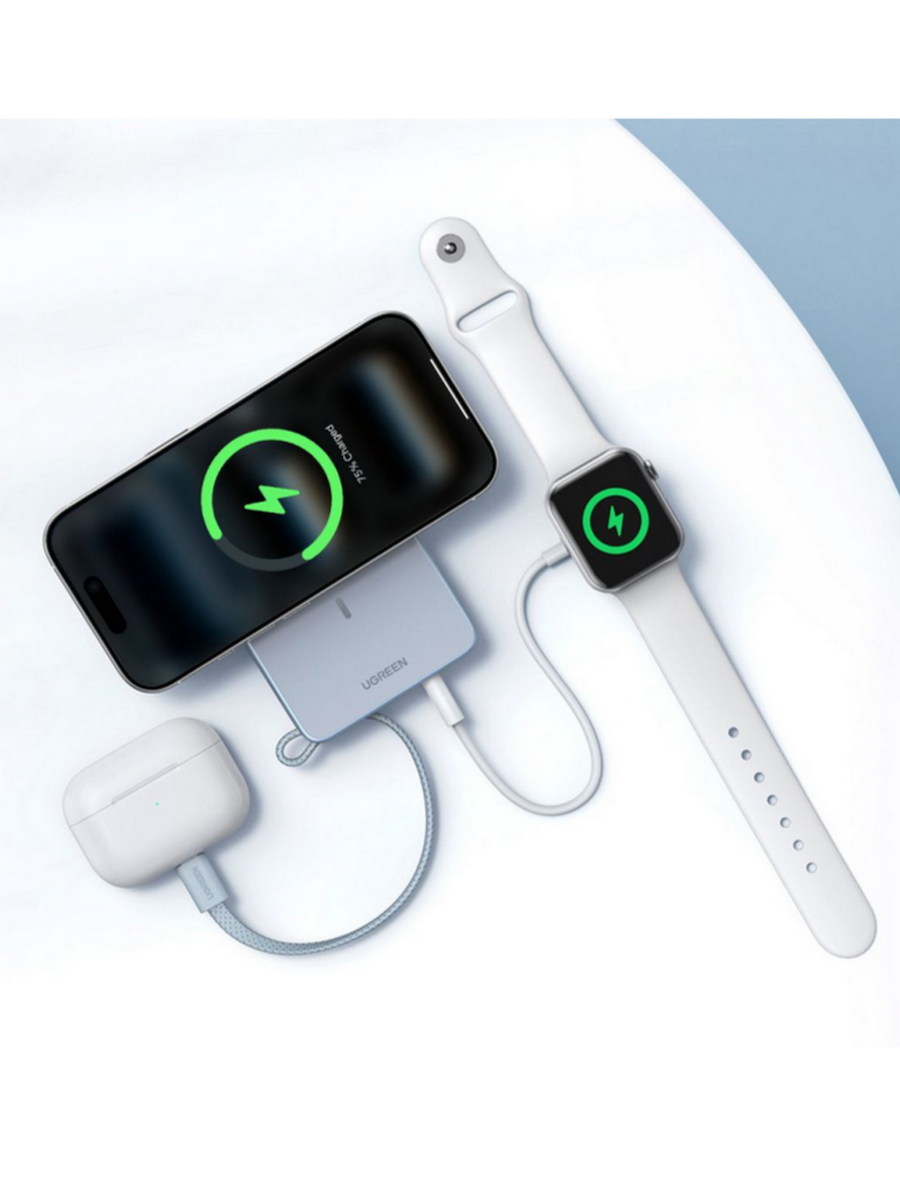 Ugreen PB773 позволяет быстро заряжать три устройства одновременно. Заряжайте смартфон по беспроводной сети, а наушники и другое устройство — с помощью встроенного кабеля USB Type-C и разъёма USB Type-C