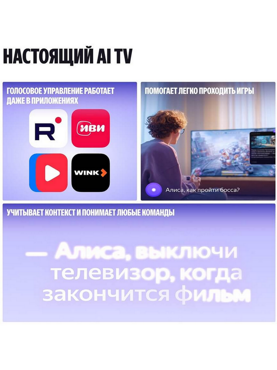 Встроенный голосовой ассистент Алиса с поддержкой YandexGPT помогает находить контент, управлять устройствами умного дома и решать повседневные задачи.