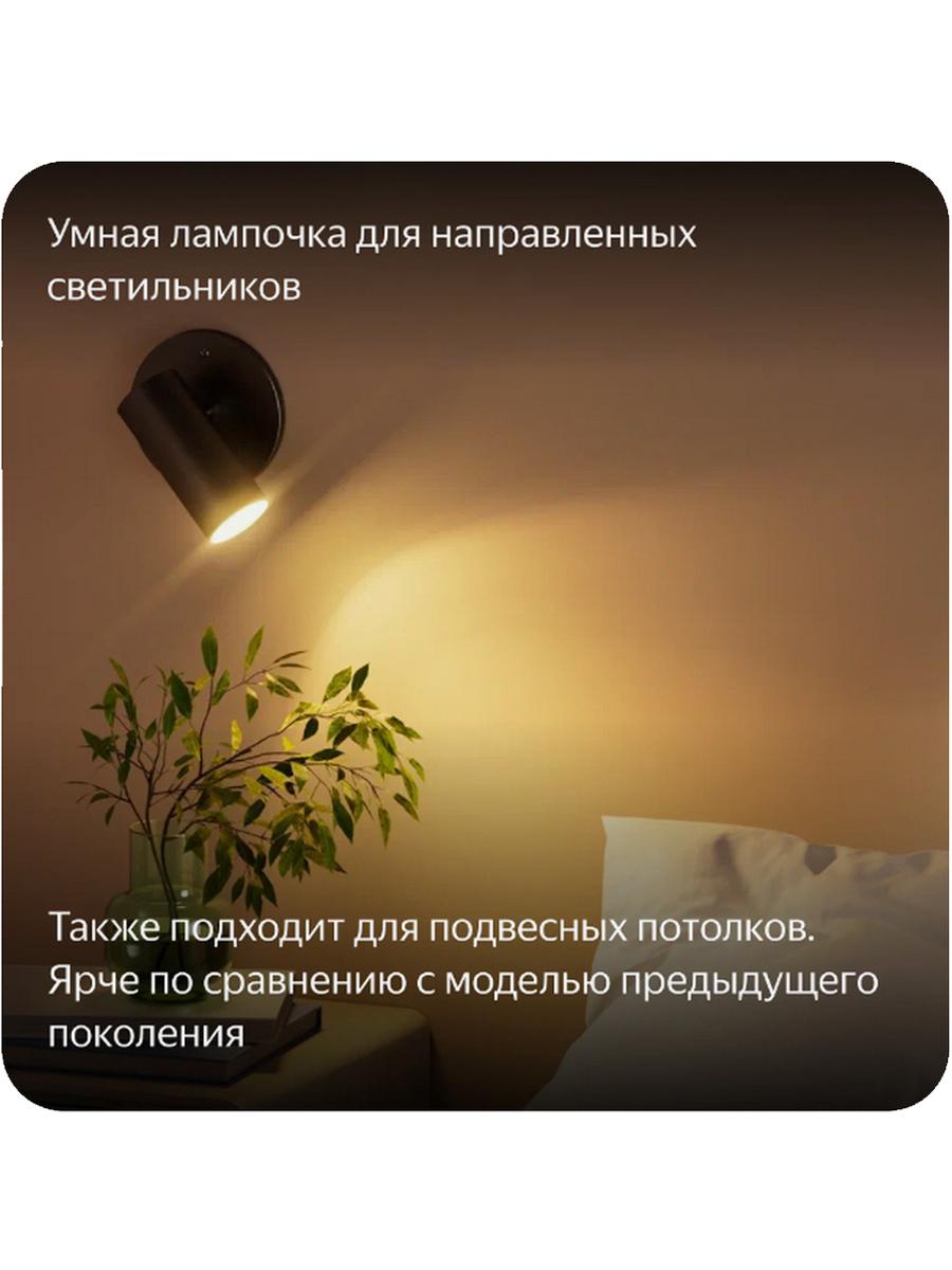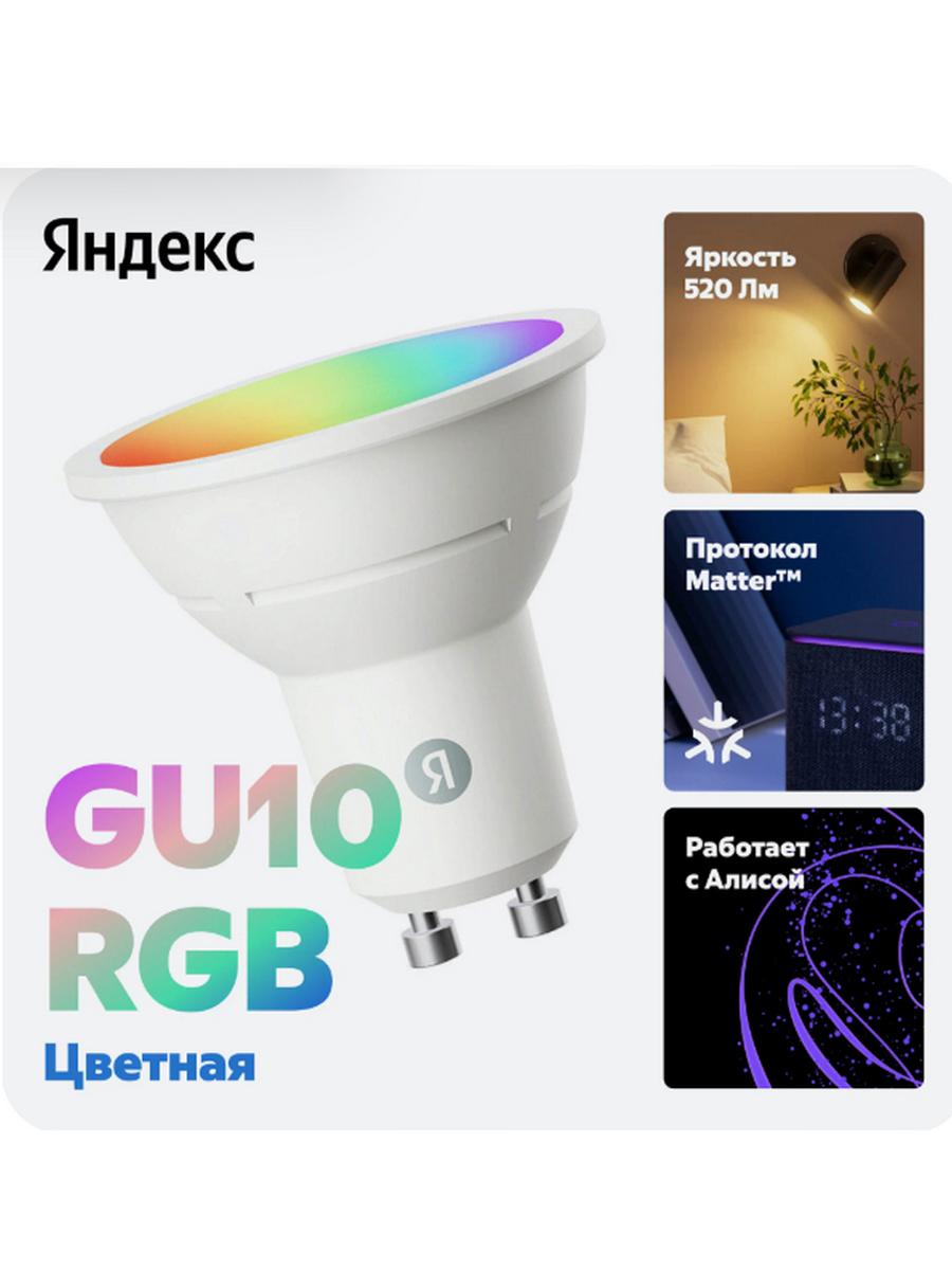Тип лампы светодиодная. Мощность 6 Вт. Тип цоколя GU10. Световой поток 520 лм. Цветовая температура от 2700 до 6500 К. Свет теплый, холодный, дневной белый. Форма лампы полусфера. Колба матовая. Управление с мобильного устройства есть. Поддержка ОС Android и iOS. Поддержка Wi Fi есть. Голосовое управление поддерживается. Есть регулировка подсветки, смена цветовой гаммы, автоматическое включение и выключение, регулировка яркости. Поддерживается система умный дом Яндекс. Работает на протоколе Matter over Wi Fi, поддерживает сценарии при отсутствии интернета. Для работы требуется Яндекс Станция или другое устройство с хабом, поддерживающим протокол Matter. Напряжение питания 220 240 В. В комплекте инструкция.