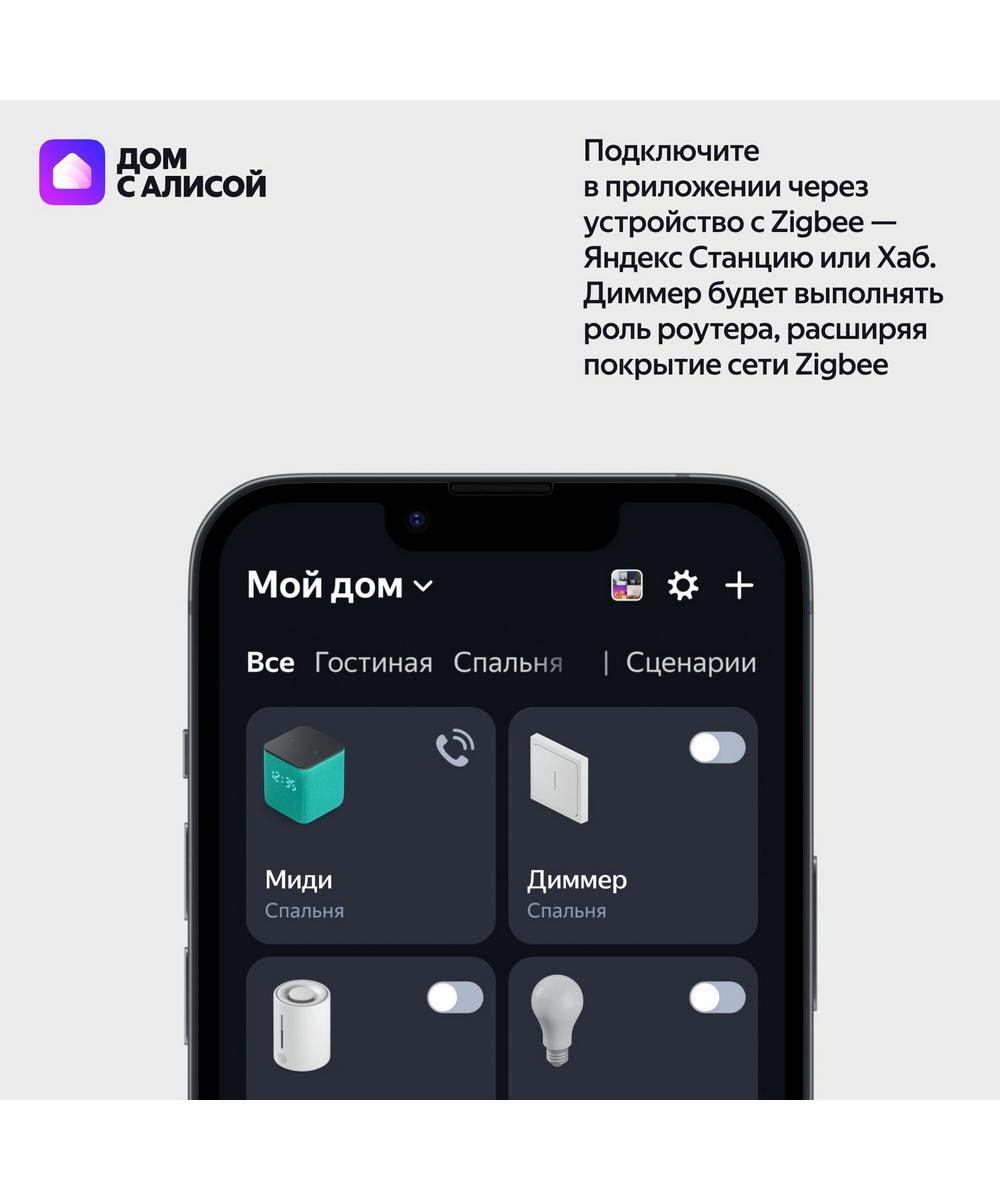 Технология Zigbee обеспечивает надёжное соединение с экосистемой умного дома. Для работы требуется Яндекс Станция с поддержкой Zigbee (Дуо Макс, Макс с Zigbee, Станция 2, Миди) или Хаб для устройств. После установки диммер также усиливает сигнал сети в помещении.
