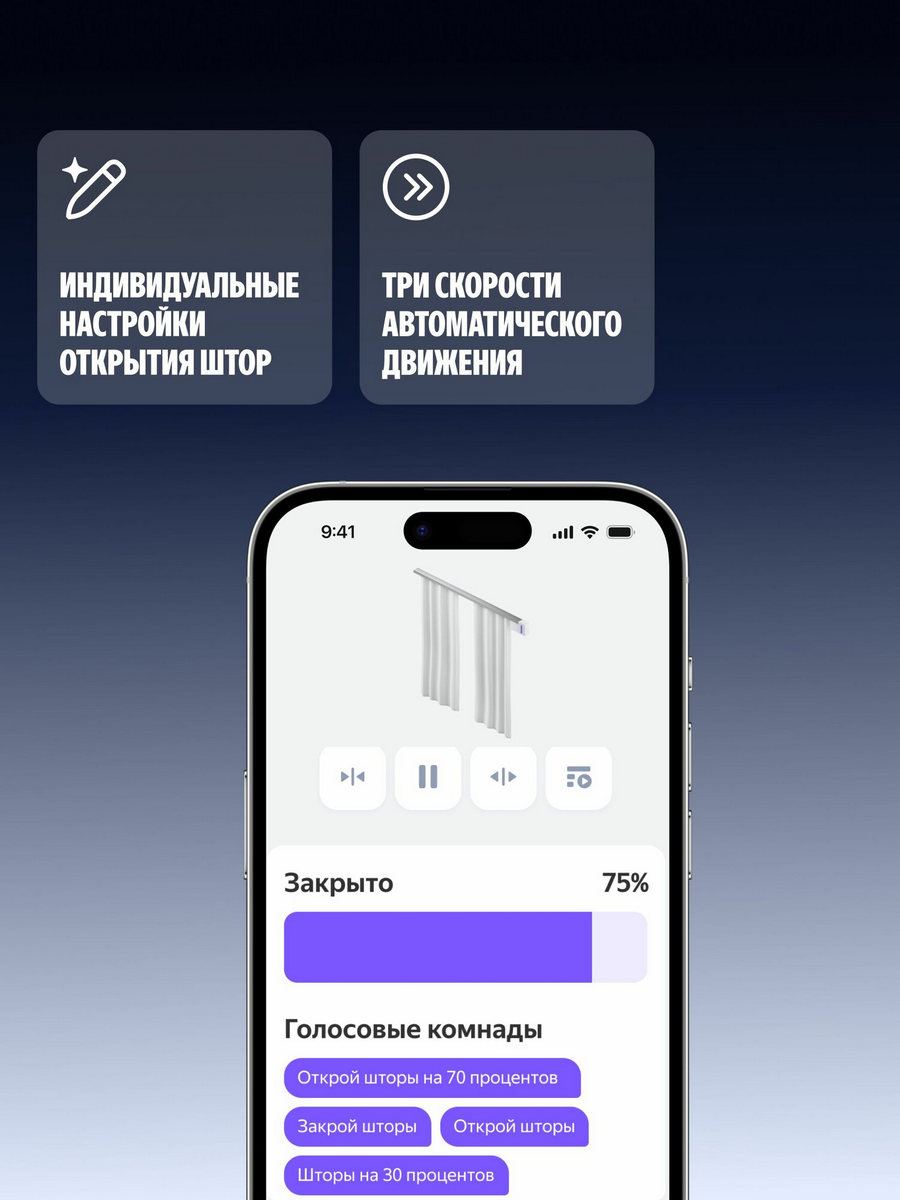 Управлять карнизом легко и удобно разными способами. Если у вас есть Яндекс Станция, вы можете отдавать голосовые команды Алисе, например, попросить открыть шторы на определённый процент. Также управление доступно через приложение Дом с Алисой, где можно настраивать сценарии вместе с другими умными устройствами. Например, шторы могут автоматически закрываться вечером, когда вы включаете свет. В приложении можно выбрать одну из трёх скоростей движения штор.